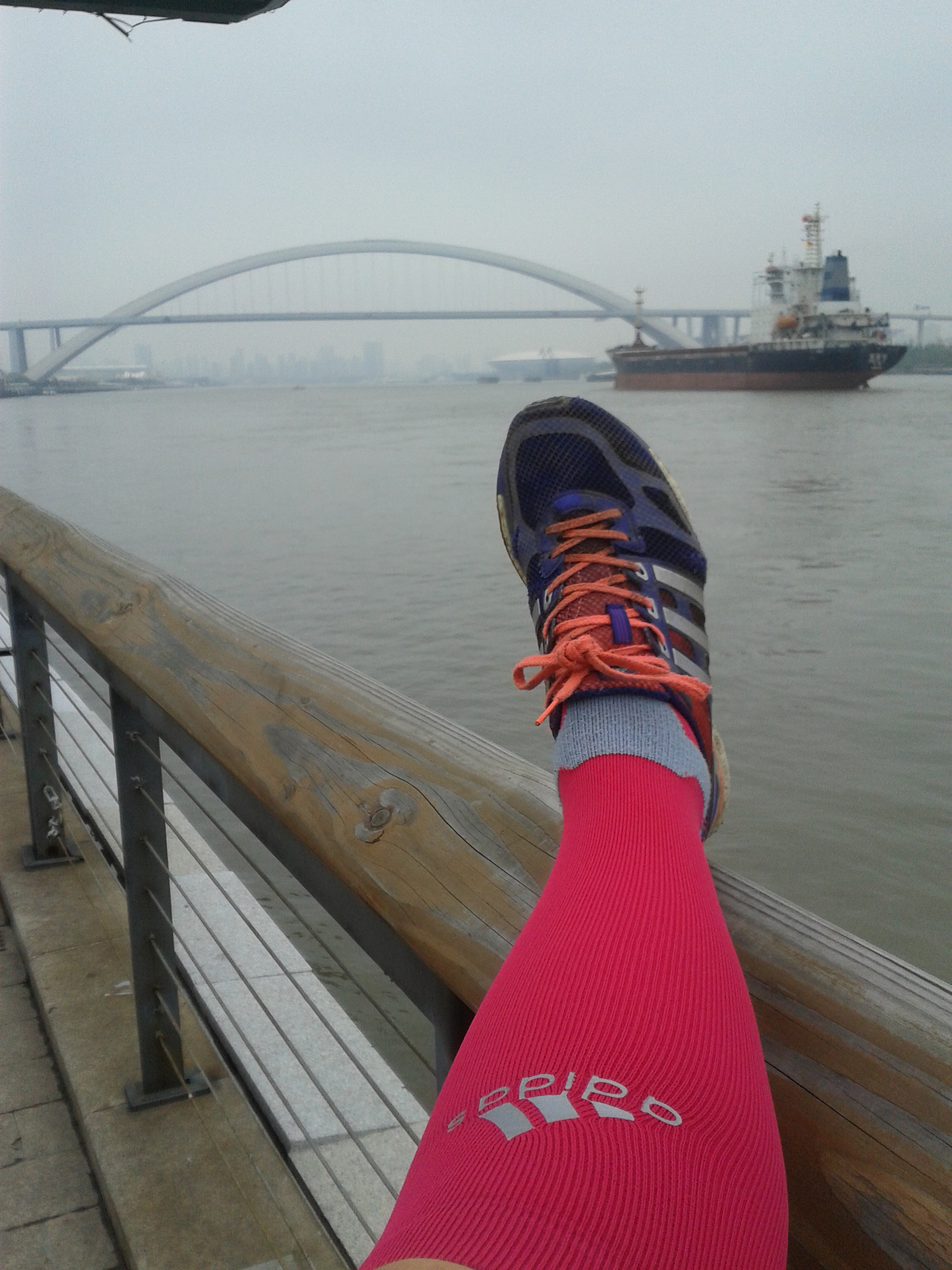 Självklart packade jag ner lite löparatteraljer i väskan däribland mina kära boost skor som sjunger på sista versen samt ett par rosa härliga compression strumpor även dem från Adidas. Första kvällen hade jag turen att träffa en Shanghai:i som jag socialiserade lite med och jag tog tillfället i akt att fråga om det fanns någon plats han rekommenderade för ett löppass. Och till min lycka hade han faktiskt flera stycken däribland en park belägen vid Hangpu river som flyter genom staden. Mina förväntningar var så gott som noll och lyckades jag skrapa ihop lite intervaller hade jag blivit nöjd.