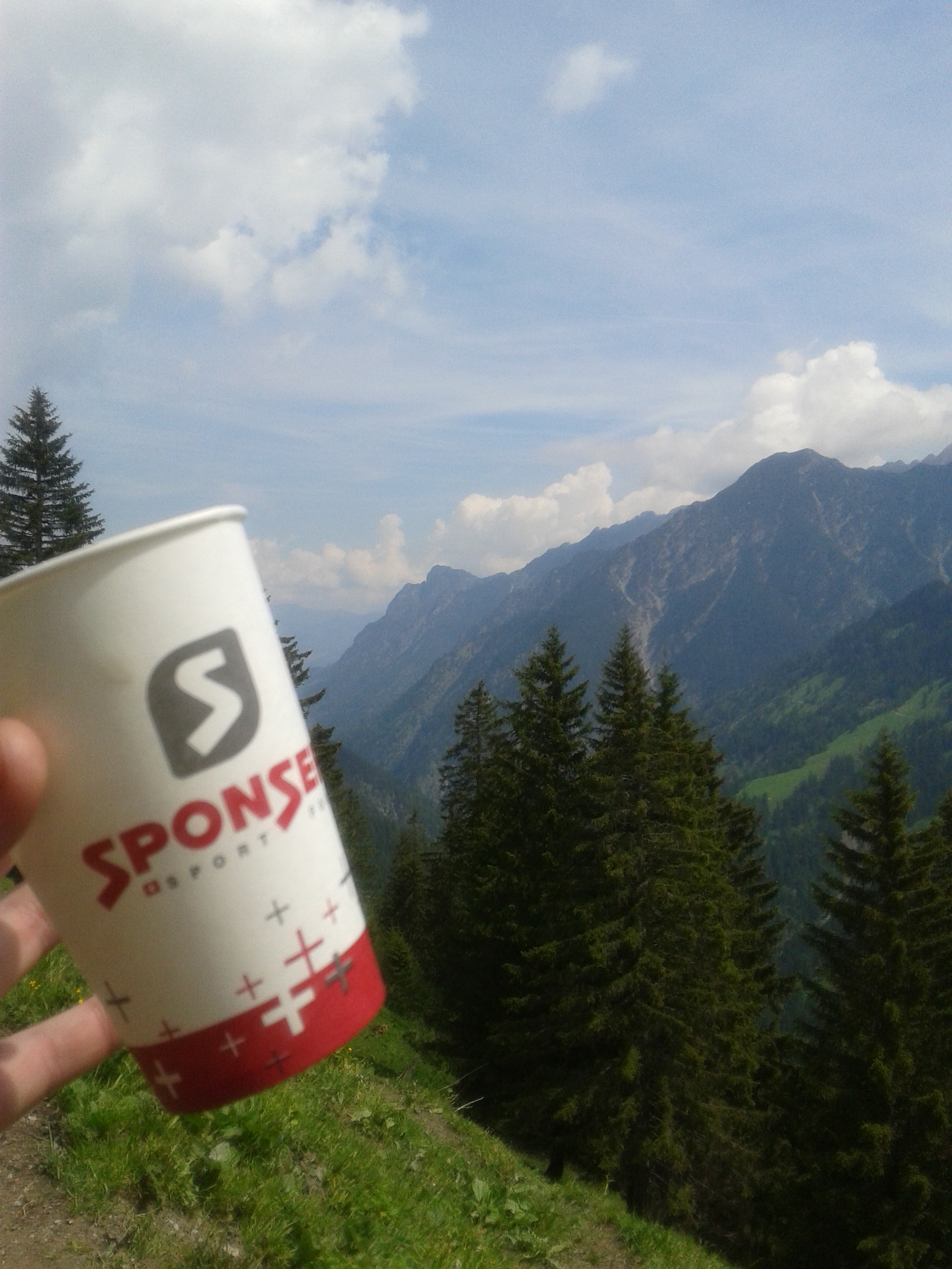 ImageSedan fortsatte loppet uppför, uppför, uppför och uppför. Här hade jag fått sällskap av en väldigt trevlig co-runner som kom från just Liechtenstein och hon berättade att om 10 minuter skulle det gå ner för. Lyckan var total här för nu hade jag lust att springa igen även om det var riktigt okej att hika också. Vi närmade oss toppen av dagens tur och jag var riktigt, riktigt törstig. Det var nu trots allt närmare tre timmar sedan starten och 19 kilometer var passerade men trots att det var många vätskekontroller är luften tunnare och jag upplever det som torrare än normalt så en kopp vatten stod högt upp på min önskelista. Men vet ni? bara minuter efter min önskan om vatten dök en vätskekontroll upp och de hade inte bara vatten utan även Coca Cola. Lyckan var total och jag har aldrig druckit en godare Cola.