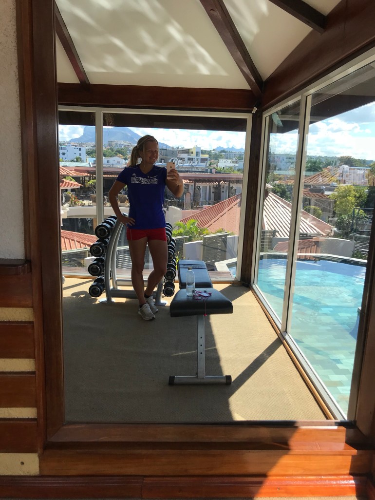 I love working out and especially on vacations when I have loads of time. This post running race day I went to the hotel gym for a session with focus on stretching, ABS and arms. I liked the hotel gym a lot and especially the view.