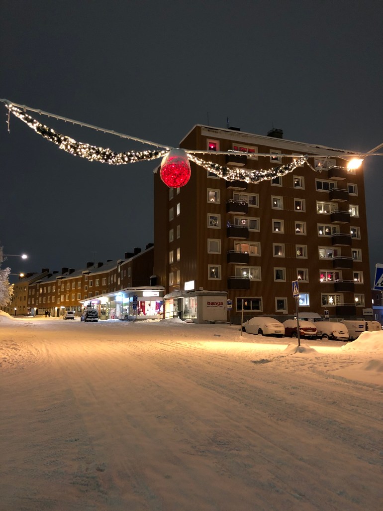 The city center was beautifully decorated with Christmas lights. It was not a beautiful place but with the snow it looked cozy. There are a lot, and I mean a lot of Thai people here in Kiruna and I also saw Thai food aim every corner.