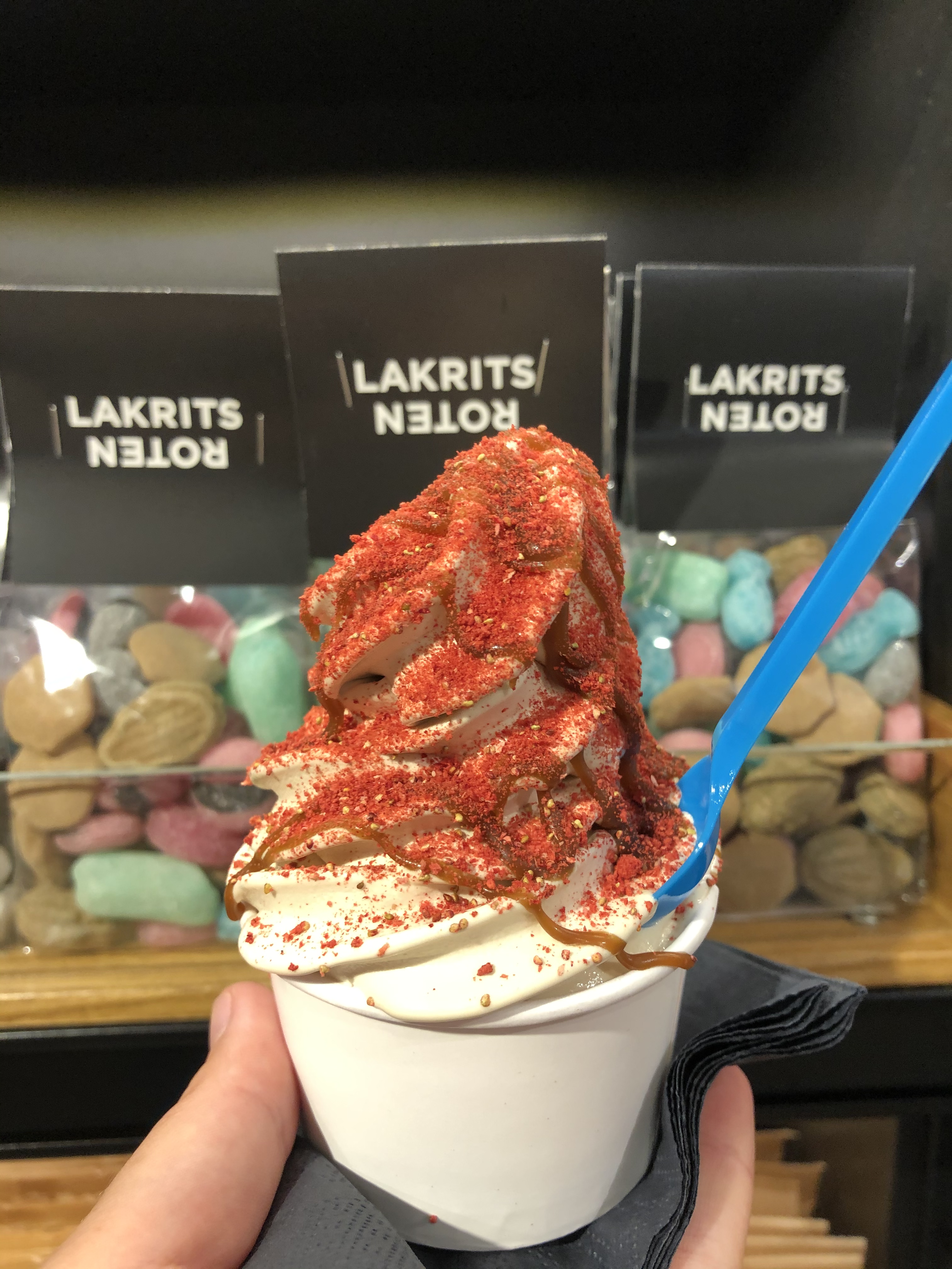 Då en bekant till mig jobbar på Lakritsroten och har lovordat glassen kände jag mig tvingad att testa. Den var precis lika god som jag kunde tänka mig och ändå älskar jag inte lakrits. Krämig och helt fantastik mjukglass toppad med kolasås och jordgubbspulver som hon som fixade glassen tipsade om. Finns på Lakritsroten i MOOD gallerian.