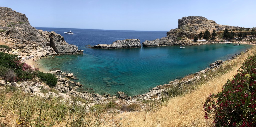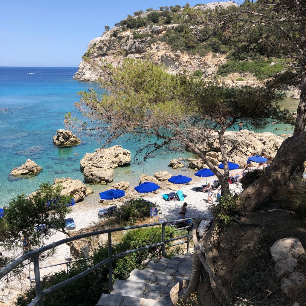 If you are looking for a stunning beach Anthony queen beach near Faliraki is the place to go. It is really a hidden gem and you can either take the paved road there or hike over the mountain from Faliraki to reach it. I was there in late May and had a fabulous day. Swimming in the crystal clear Agean sea and enjoying food at the beach bar overlooking the bay. I assume it will be crowded there during summerdays when both locals and tourists are seeking up the sun so make sure to got there during early summer/late spring or during the end of the season. I was going there with public transport and it took me around 35 minutes to walk from Faliraki.