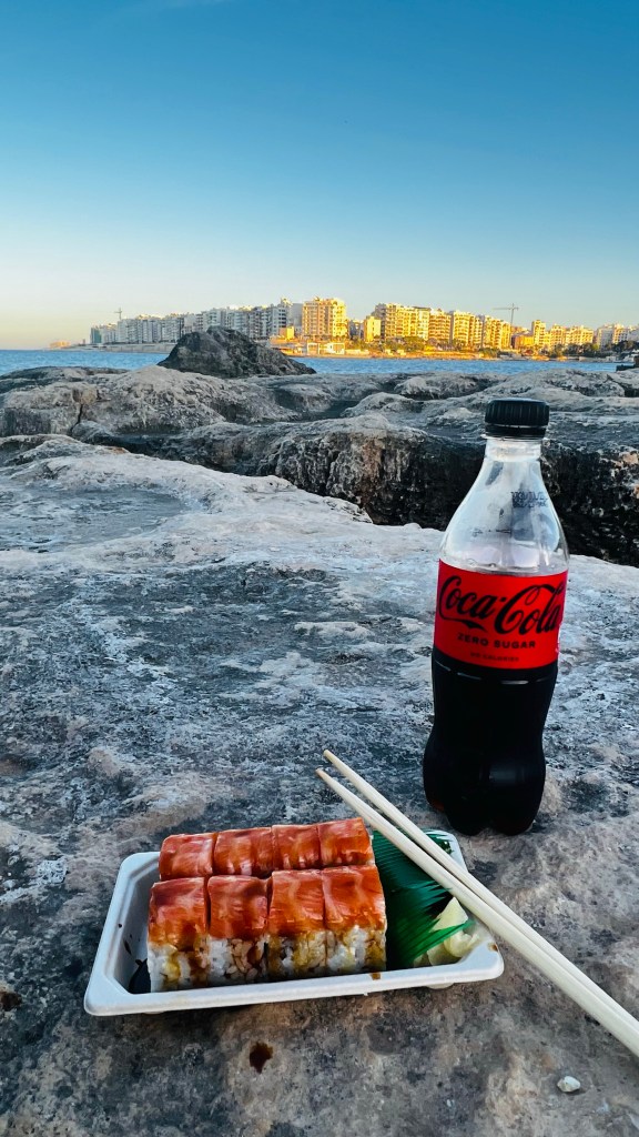 Of course I had one training evening also. Headed out at the crowded street for a 10K run. It wasn’t fast since i am having some easy training days post Sundays marathon. I also went to the gym and pool and one evening I bought my favorite sushi from Asian Kingdom which I sat down at some cliffs and enjoyed. And not surprisingly I also managed to fit in a morning walk and a swim before breakfast one day.