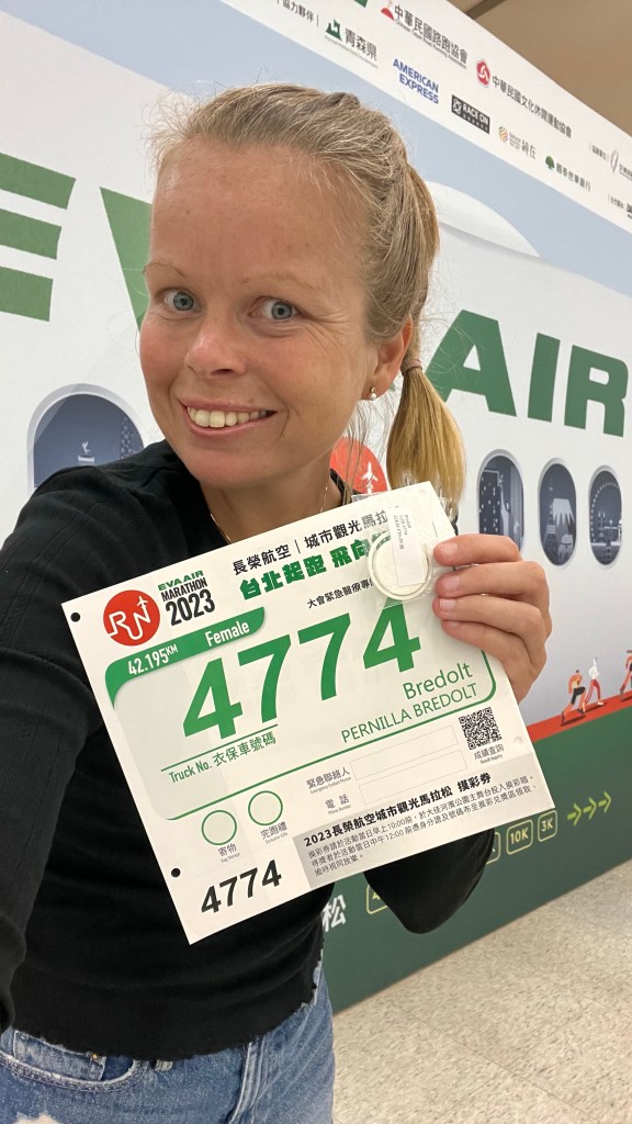 Five kilometers from the finish line I knew I was going to make sub 4. That is always a nice feeling and boost to speed up a bit to see how much on the right side it will be. I didn’t suffered to much today. Maybe all hills in Amman have helped out with leg training since the times I have been doing weight exercises with my legs since April can be counted at one hand. 40K passed and I just wanted to be finished. Why does the last two kilometers always feel like 20? Slowly, slowly the meters increased at my watch and in what felt forever I finally saw the finish line. One more medal to cash in to the collection. A nice one. An aircraft engine which make sense since the airline Eva Air was the title sponsor. And a generous goodie bag waited after the finish line. I really enjoyed this race and it is different than running in Europe or US. Less entertainment and more focus on running. No sharp elbows and no runners laying on the side wining or that have pushed themselves over their limits. Bonus of the day was a new PB. 03:51:46. My Chinese is to bad to find the official website results so I don’t know what official time I got yet. It was a nice race. I enjoyed it!