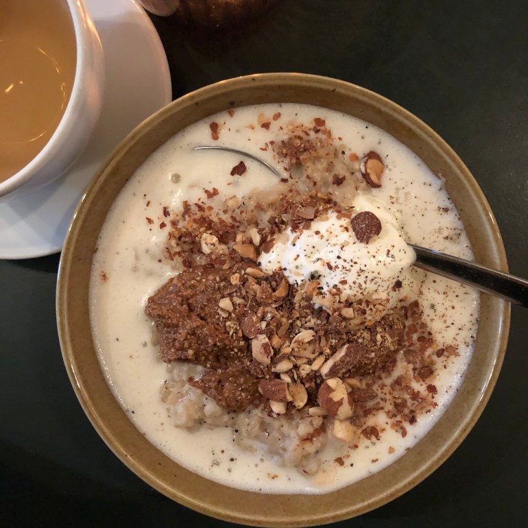Semla porridge served during the Semla season at my favorite brunch place in Stockholm was wonderful and more than filling. Not sweet but rich and fantastically tasty. Plenty of toppings too. This gets a four out of five Semla ratings. You can find the porridge during the Semla season at Pom & Flora on Odengatan. In 2025 they also serve banana bread semla version but I have not tried it. Anyone else who did?