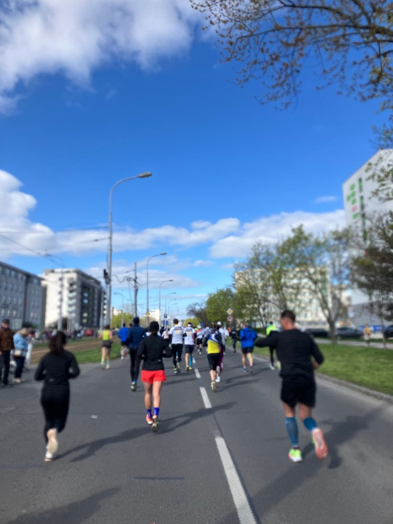 It was so cold. The wind was right in the face and tried to cover my fingers with my top. It helped a little but I wished I had a pair of gloves. Had downloaded the track to my Garmin and made race myself with target time 3:55:00. I would be happy if I made sub 4 with the amount of training I had in my backpack. Longer runs are the key to marathons and I had not done my homework. Half marathon and marathon started at the same time so it was rather packed on the course. Nice because it helped for heating purposes. My legs felt great and I was way ahead of my time the first 10K. The route was already very boring. Not many people out watching and straight road with Sovijet buildings on the side.