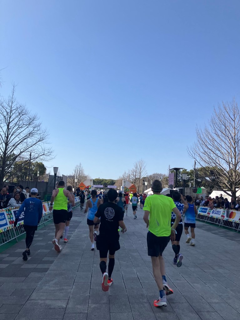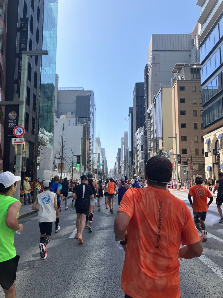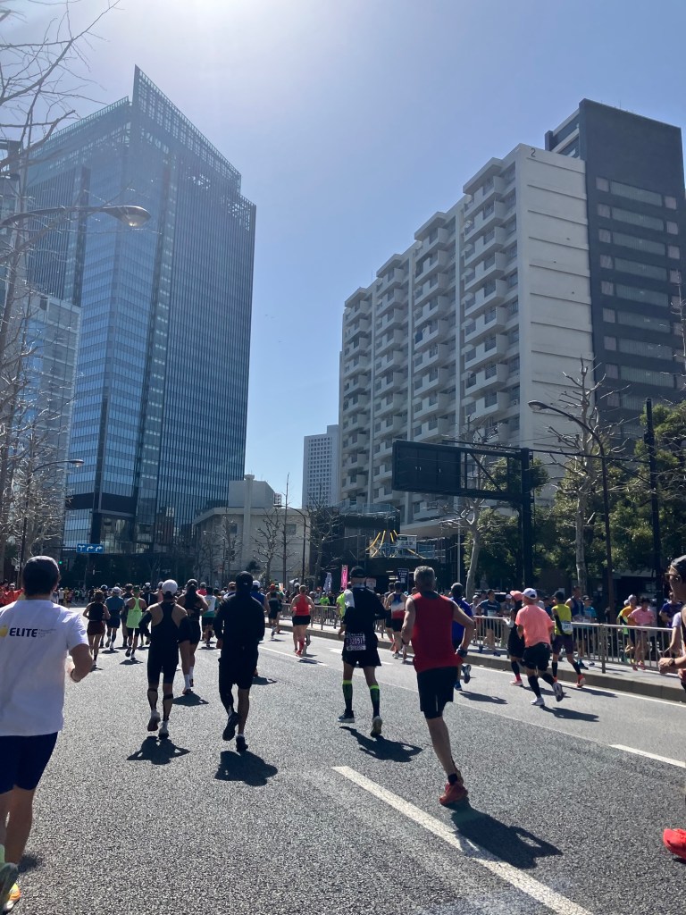 39 000 runners that got the sought after places had started to move. It was a bit surreal. High rise government buildings in the part Shinjuku around us and quietness. You could hear carbon fibre shoes stepping on the ground and it was packed. One guy managed to pull his hand under my bib so I lost one of my attachment magnets. I kicked my left toe into a cone and it was hurting like. A lot. Damn. Already had a blue toe nail and I could feel it came off a bit.
